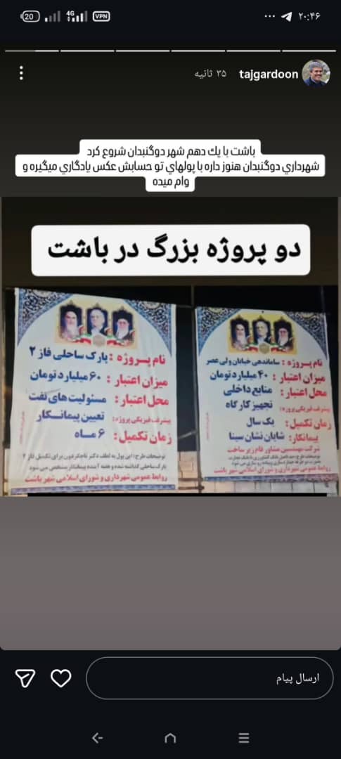 *🔴 کنایه سنگین تاجگردون به شهرداری دوگنبدان* *شهرداری باشت شروع کرد، پول شهرداری دوگنبدان درحساب برای وام* *📌 غلامرضا تاجگردون…
